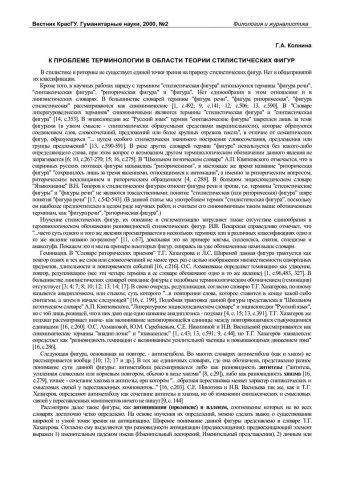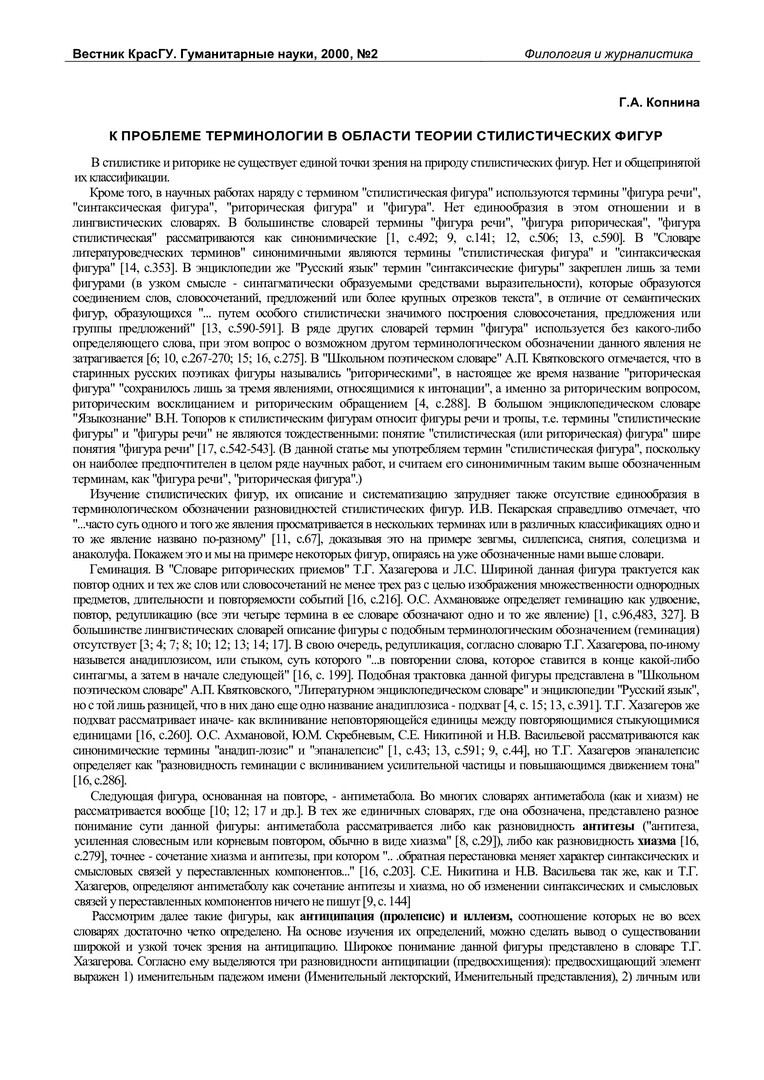 Библиографическое описание:Копнина, Галина Анатольевна. К проблеме терминологии в области теории стилистических фигур / Г. А. Копнина. - Текст : непосредственный // Вестник Красноярского государственного университета. - 2000. - Гуманитарные науки, № 2. - С. 99-101. - Библиогр. в конце ст.