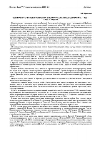 Библиографическое описание:Гришаев, Василий Васильевич. Великая Отечественная война в исторических исследованиях 1960-1990-х годов / В. В. Гришаев. - Текст : непосредственный // Вестник Красноярского государственного университета. - 2001. - Гуманитарные науки, № 1. - С. 33-34. - Библиогр. в конце ст.