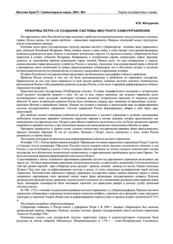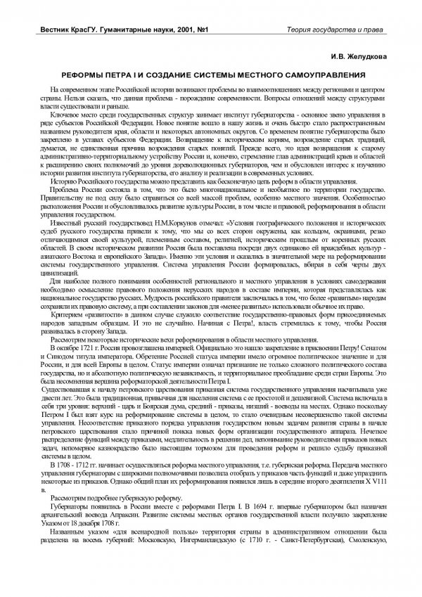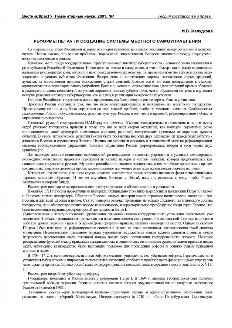 Библиографическое описание:Желудкова, Ирина Витальевна. Реформы Петра I и создание системы местного самоуправления / И. В. Желудкова. - Текст : непосредственный // Вестник Красноярского государственного университета. - 2001. - Гуманитарные науки, № 1. - С. 92-94. - Библиогр. в конце ст.
