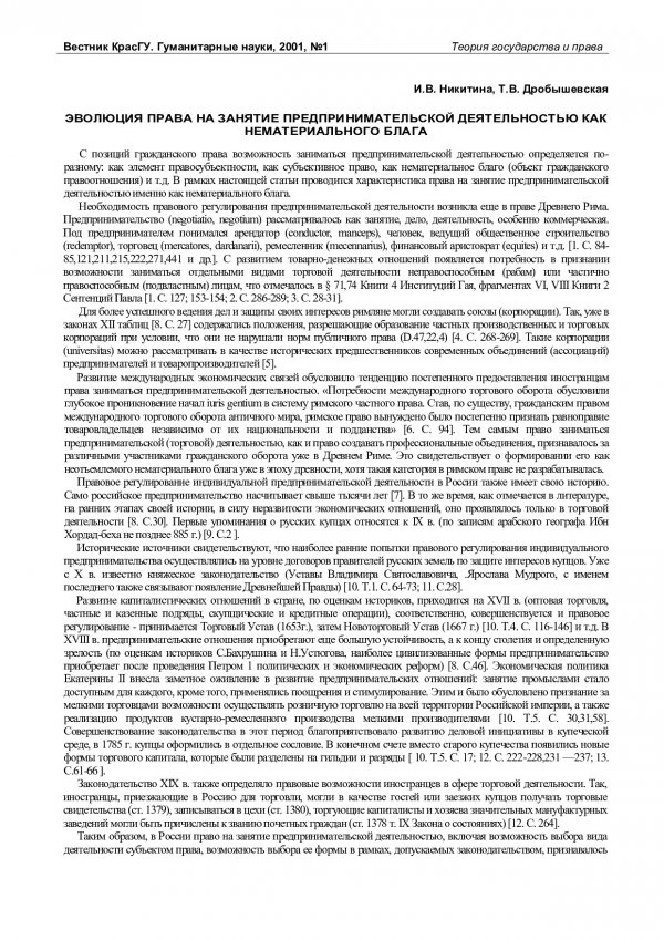 Библиографическое описание:Никитина, Ирина Вениаминовна. Эволюция права на занятие предпринимательской деятельностью как нематериального блага / И. В. Никитина, Т. В. Дробышевская. - Текст : непосредственный // Вестник Красноярского государственного университета. - 2001. - Гуманитарные науки, № 1. - С. 72-76. - Библиогр. в конце ст.