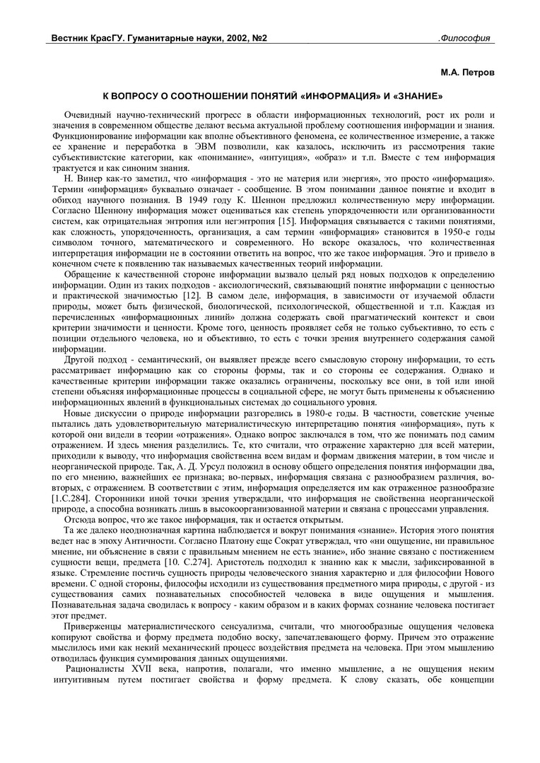 Библиографическое описание:Петров, Михаил Александрович. К вопросу о соотношении понятий "информация" и "знание" / М. А. Петров. - Текст : непосредственный // Вестник Красноярского государственного университета. - 2002. - Гуманитарные науки, № 2. - С. 13-16. - Библиогр. в конце ст.