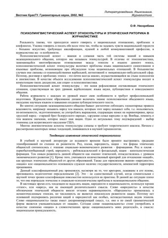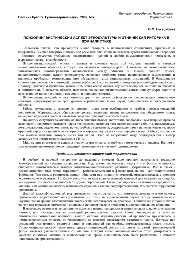 Библиографическое описание:Нескрябина, Ольга Федоровна. Психолингвистический аспект этнокультуры и этническая риторика в журналистике / О. Ф. Нескрябина. - Текст : непосредственный // Вестник Красноярского государственного университета. - 2002. - Гуманитарные науки, № 2. - С. 149-152. - Библиогр. в конце ст.