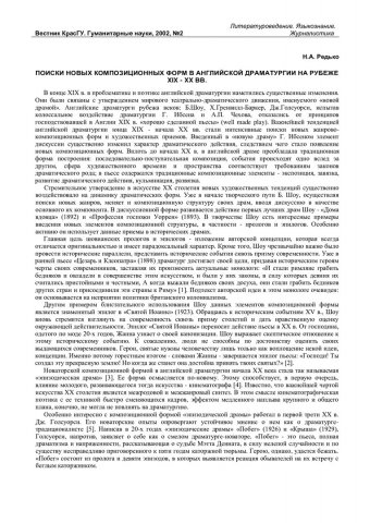 Библиографическое описание:Редько, Наталья Анатольевна. Поиски новых композиционных форм в английской драматургии на рубеже XIX-XX вв. / Н. А. Редько. - Текст : непосредственный // Вестник Красноярского государственного университета. - 2002. - Гуманитарные науки, № 2. - С. 117-120. - Библиогр. в конце ст.