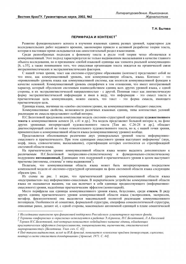 Бытева, Татьяна Исааковна. Перифраза и контекст / Т. И. Бытева. - Текст : непосредственный // Вестник Красноярского государственного университета. - 2002. - Гуманитарные науки, № 2. - С. 140-145. - Библиогр. в конце ст.