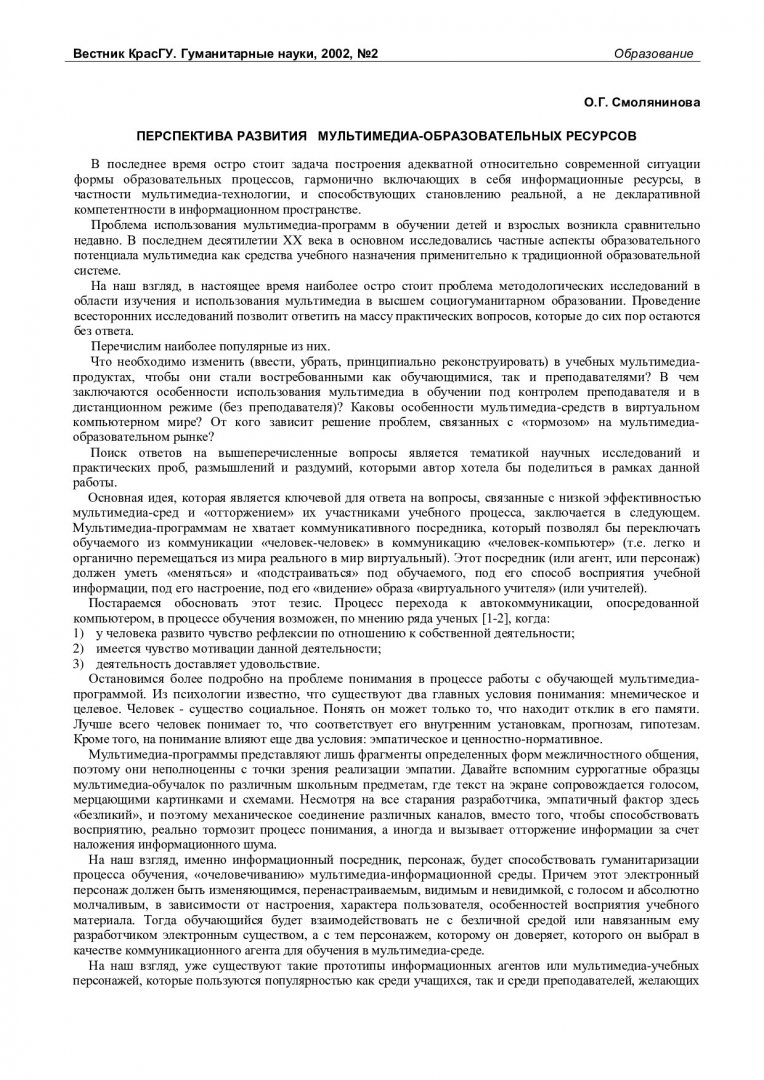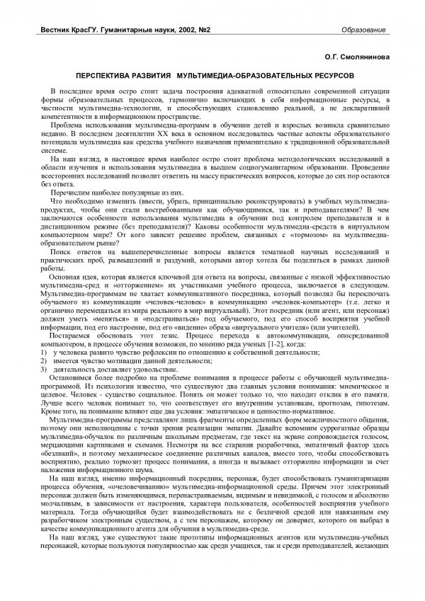 Библиографическое описание:Смолянинова, Ольга Георгиевна. Перспектива развития мультимедиа-образовательных ресурсов / О. Г. Смолянинова. - Текст : непосредственный // Вестник Красноярского государственного университета. - 2002. - Гуманитарные науки, № 2. - С. 50-53. - Библиогр. в конце ст.