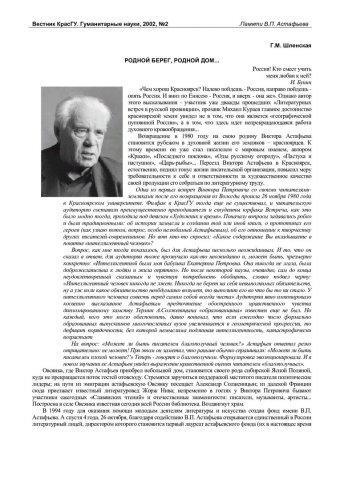 Библиографическое описание:Шленская, Галина Максимовна. Родной берег, родной дом... : [памяти В. П. Астафьева] / Г. М. Шленская. - Текст : непосредственный // Вестник Красноярского государственного университета. - 2002. - Гуманитарные науки, № 2. - С. 5-12.