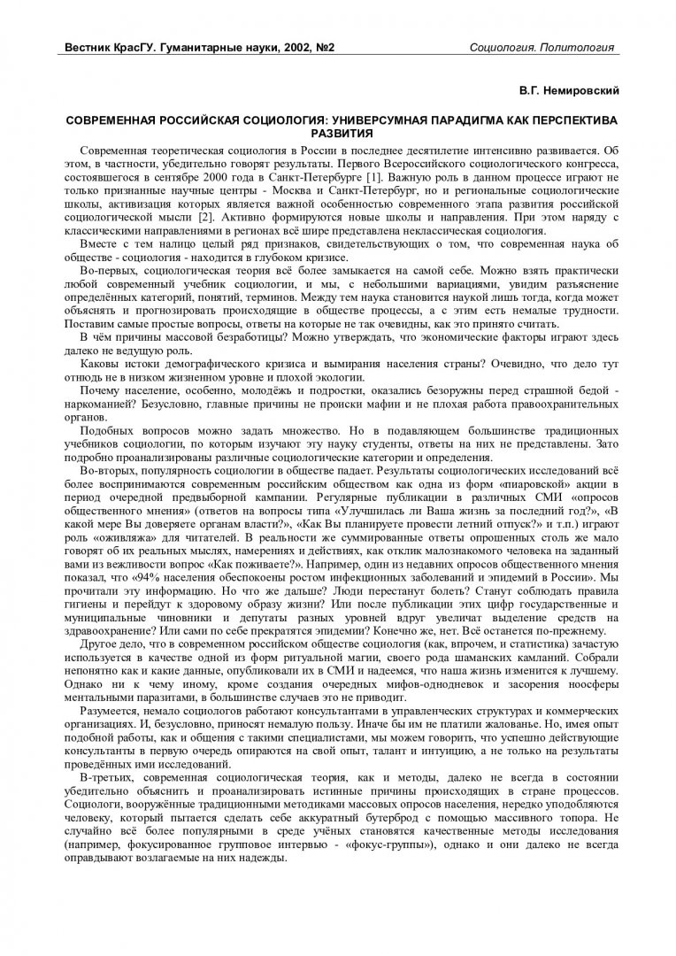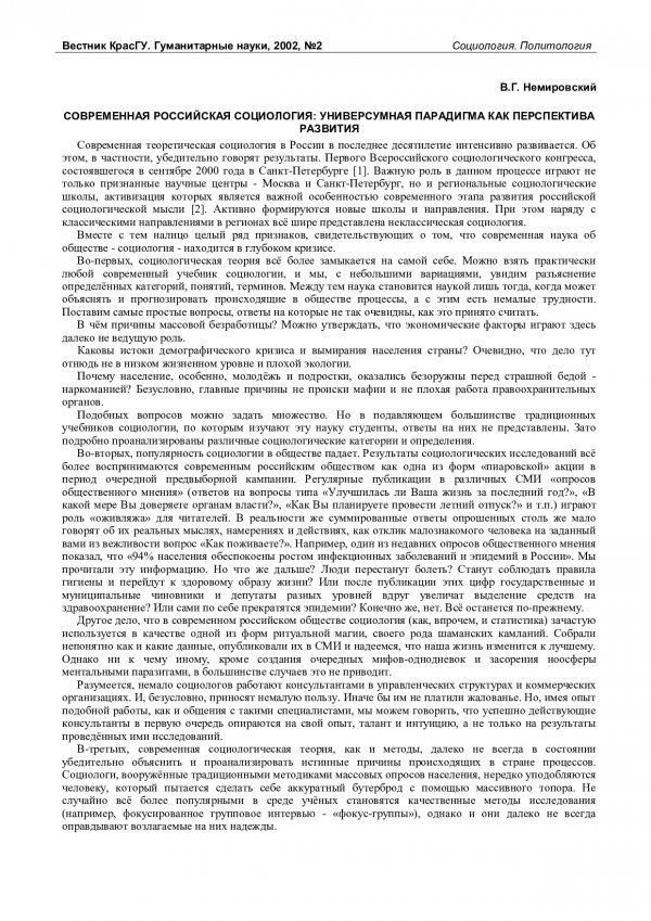 Библиографическое описание:Немировский, Валентин Геннадьевич. Современная российская социология: универсумная парадигма как перспектива развития / В. Г. Немировский. - Текст : непосредственный // Вестник Красноярского государственного университета. - 2002. - Гуманитарные науки, № 2. - С. 56-62. - Библиогр. в конце ст.