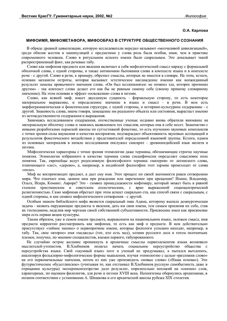 Библиографическое описание:Карлова, Ольга Анатольевна. Мифоимя, мифометафора, мифообраз в структуре общественного сознания / О. А. Карлова. - Текст : непосредственный // Вестник Красноярского государственного университета. - 2002. - Гуманитарные науки, № 2. - С. 20-24.
