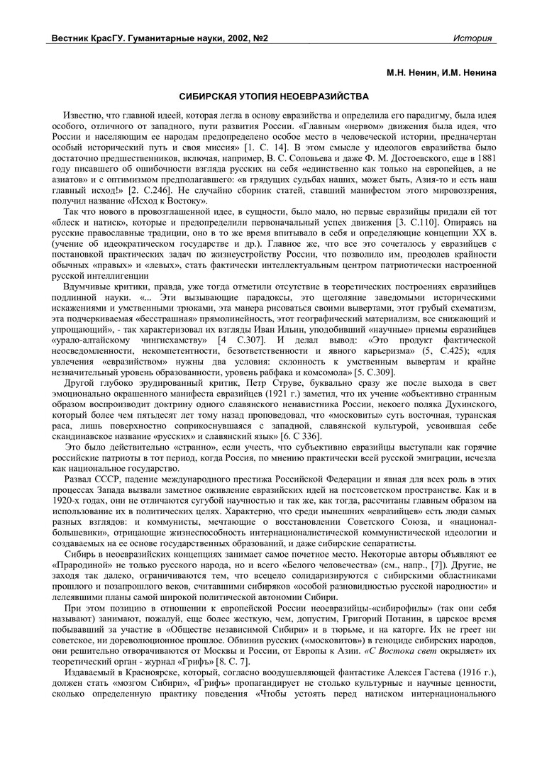 Библиографическое описание:Ненин, Михаил Николаевич. Сибирская утопия неоевразийства / М. Н. Ненин, И. М. Ненина. - Текст : непосредственный // Вестник Красноярского государственного университета. - 2002. - Гуманитарные науки, № 2. - С. 93-94. - Библиогр. в конце ст.