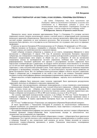 Библиографическое описание:Желудкова, Ирина Витальевна. Генерал-губернатор "и как глава, и как хозяин". Реформы Екатерины II / И. В. Желудкова. - Текст : непосредственный // Вестник Красноярского государственного университета. - 2002. - Гуманитарные науки, № 2. - С. 105-108. - Библиогр. в конце ст.