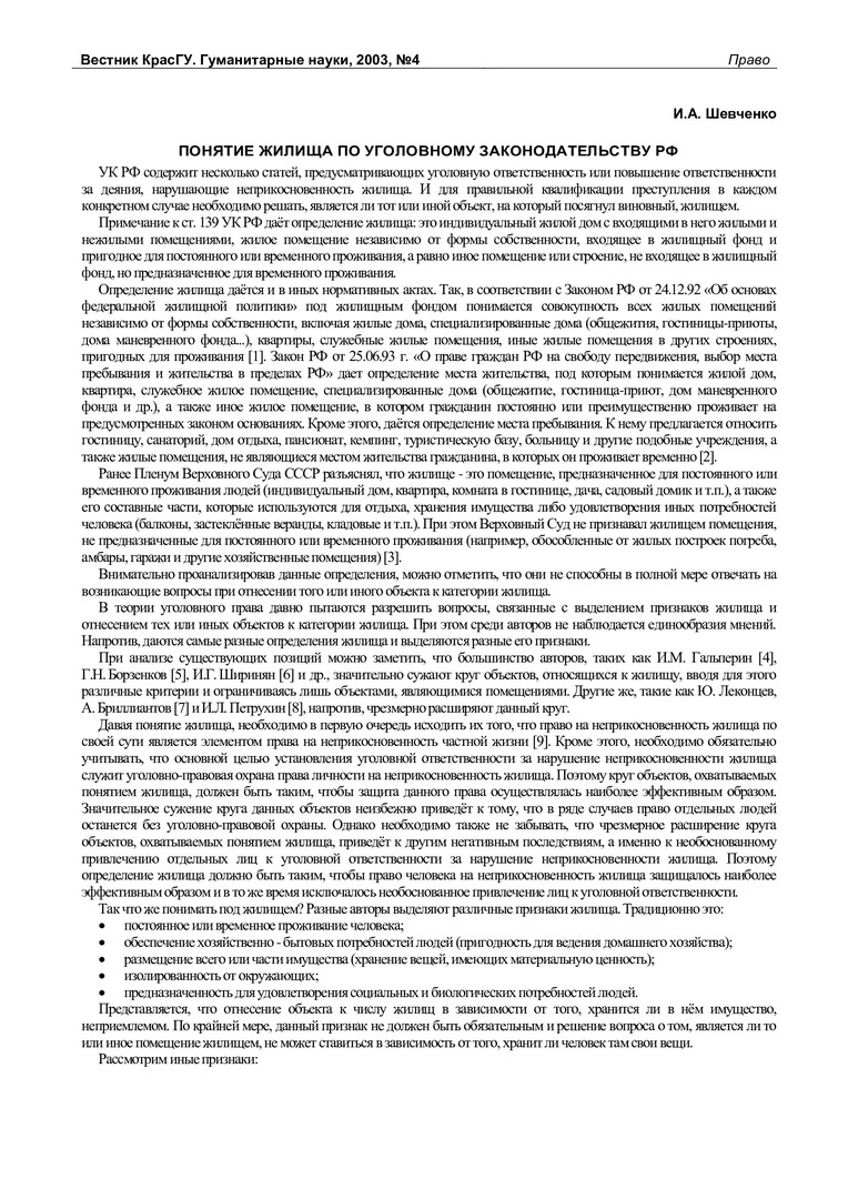 Библиографическое описание:Шевченко, Илья Александрович. Понятие жилища по уголовному законодательству РФ / И. А. Шевченко. - Текст : непосредственный // Вестник Красноярского государственного университета. - 2003. - Гуманитарные науки, № 4. - С. 97-100. - Библиогр. в конце ст.