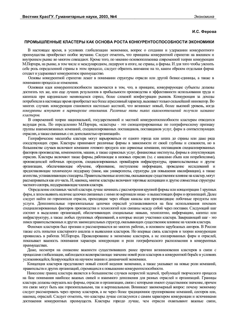 Библиографическое описание:Ферова, Ирина Сергеевна. Промышленные кластеры как основа роста конкурентоспособности экономики / И. С. Ферова. - Текст : непосредственный // Вестник Красноярского государственного университета. - 2003. - Гуманитарные науки, № 4. - С. 38-40. - Библиогр. в конце ст.