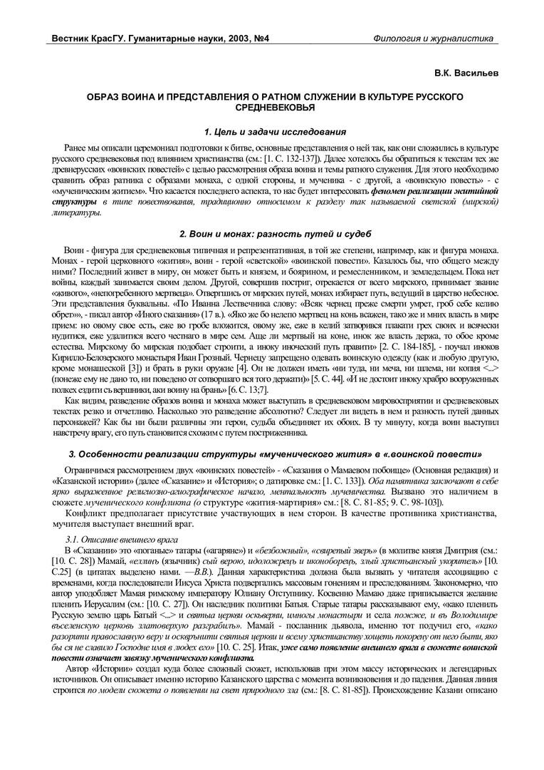 Библиографическое описание:Васильев, Виталий Константинович. Образ воина и представления о ратном служении в культуре русского средневековья / В. К. Васильев. - Текст : непосредственный // Вестник Красноярского государственного университета. - 2003. - Гуманитарные науки, № 4. - С. 132-136. - Библиогр. в конце ст.