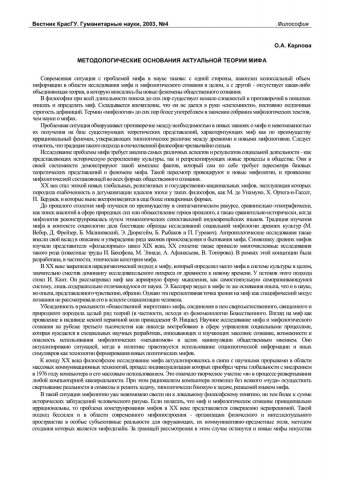 Библиографическое описание:Карлова, Ольга Анатольевна. Методологические основания актуальной теории мифа / О. А. Карлова. - Текст : непосредственный // Вестник Красноярского государственного университета. - 2003. - Гуманитарные науки, № 4. - С. 14-16.