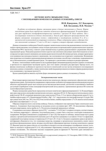Библиографическое описание:Изучение форм связывания урана с поглащающим комплексом донных отложенний р. Енисея / Ю. В. Каверзина, Л. Г. Бондарева, В. В. Богданова, Н. В. Мазняк. - Текст : непосредственный // Вестник Красноярского государственного университета. - 2003. - Естественные науки, № 2. - С. 129-132. - Библиогр. в конце ст.