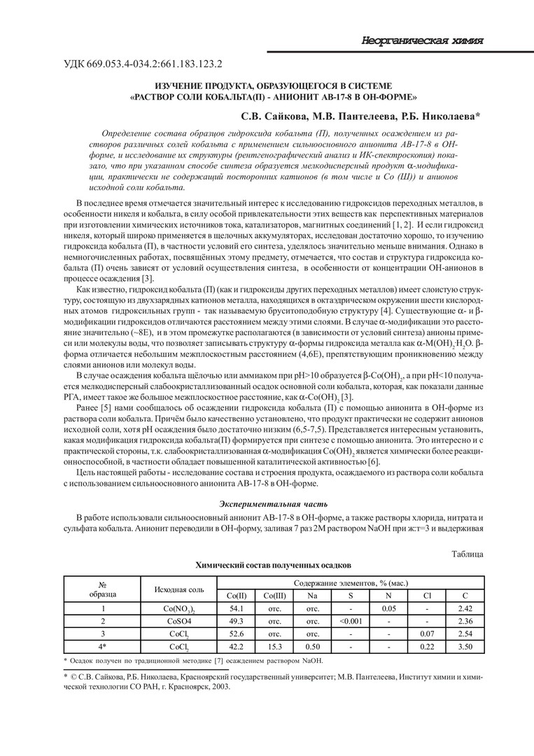 Библиографическое описание:Сайкова, Светлана Васильевна. Изучение продукта, образующегося в системе "раствор соли кобальта(II) - анионит АВ-17-8 в ОН-форме" / С. В. Сайкова, М. В. Пантелеева, Р. Б. Николаева. - Текст : непосредственный // Вестник Красноярского государственного университета. - 2003. - Естественные науки, № 2. - С. 110-114. - Библиогр. в конце ст.