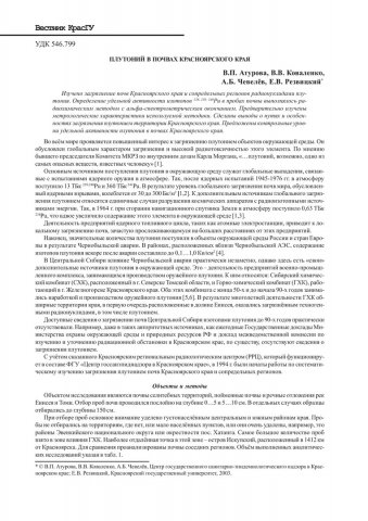 Библиографическое описание:Плутоний в почвах Красноярского края / В. П. Атурова, В. В. Коваленко, А. Б. Чевелев, Е. В. Резвицкий. - Текст : непосредственный // Вестник Красноярского государственного университета. - 2003. - Естественные науки, № 2. - С. 164-171. - Библиогр. в конце ст.