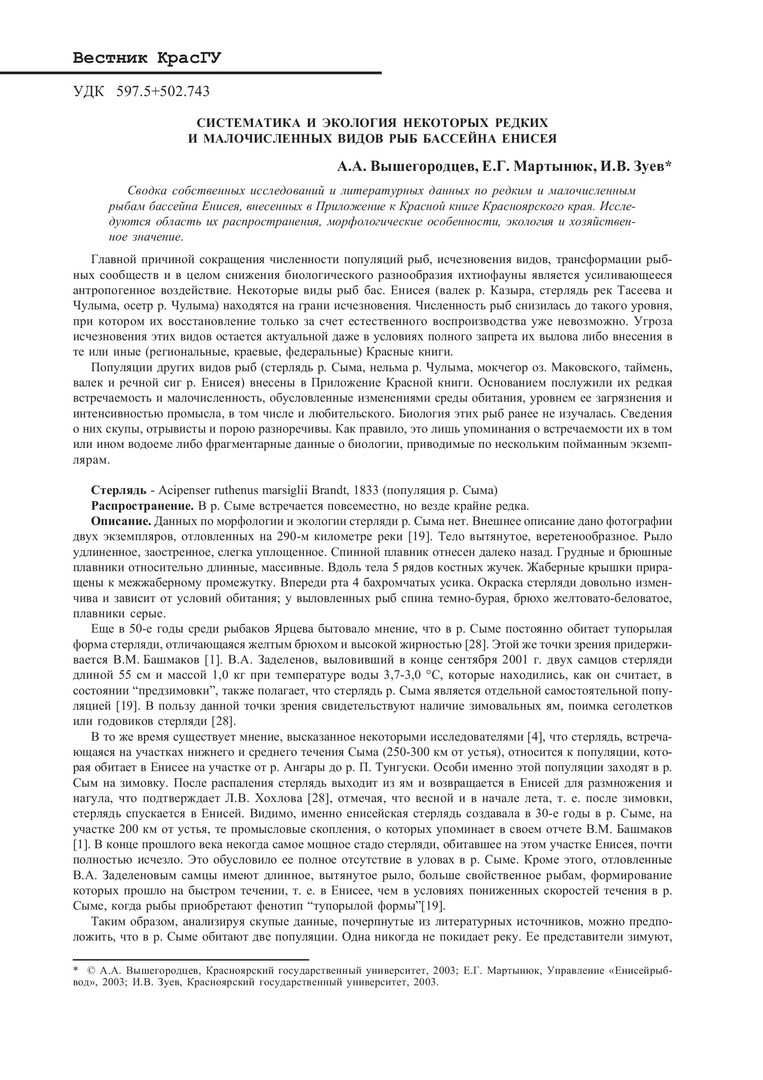 Библиографическое описание:Вышегородцев, Анатолий Алексеевич. Систематика и экология некоторых редких и малочисленных видов рыб бассейна Енисея / А. А. Вышегородцев, Е. Г. Мартынюк, И. В. Зуев. - Текст : непосредственный // Вестник Красноярского государственного университета. - 2003. - Естественные науки, № 5. - С. 84-91. - Библиогр. в конце ст.