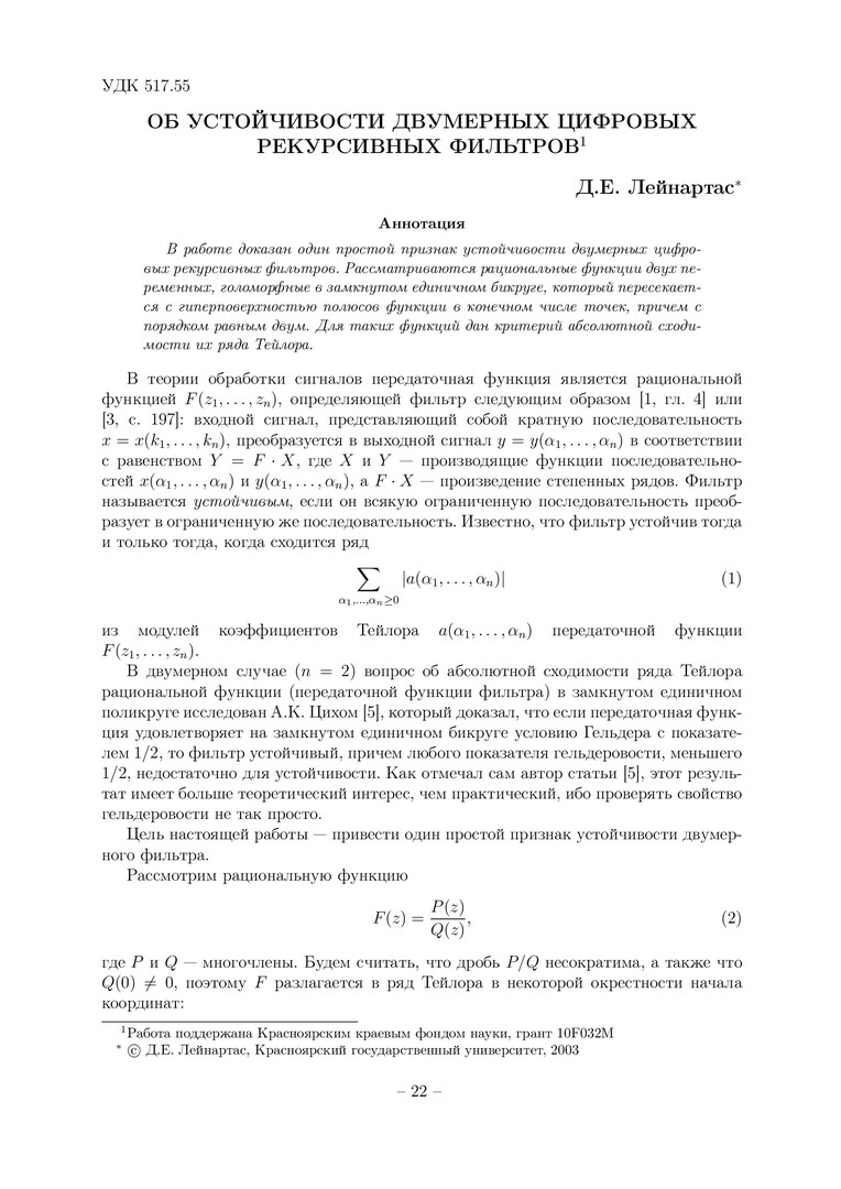 Библиографическое описание:Лейнартас, Денис Евгеньевич. Об устойчивости двумерных цифровых рекурсивных фильтров / Д. Е. Лейнартас. - Текст : непосредственный // Вестник Красноярского государственного университета. - 2003. - Физико-математические науки, № 1. - С. 22-26. - Библиогр. в конце ст.