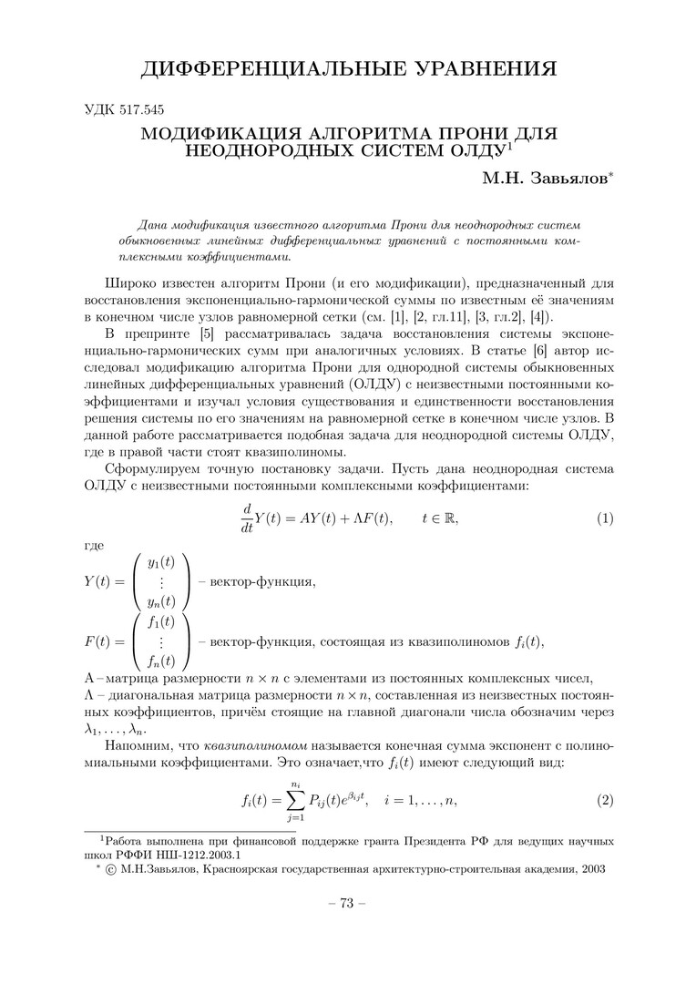 Библиографическое описание:Завьялов, Максим Николаевич. Модификация алгоритма Прони для неоднородных систем ОЛДУ / М. Н. Завьялов. - Текст : непосредственный // Вестник Красноярского государственного университета. - 2003. - Физико-математические науки, № 1. - С. 73-79. - Библиогр. в конце ст.