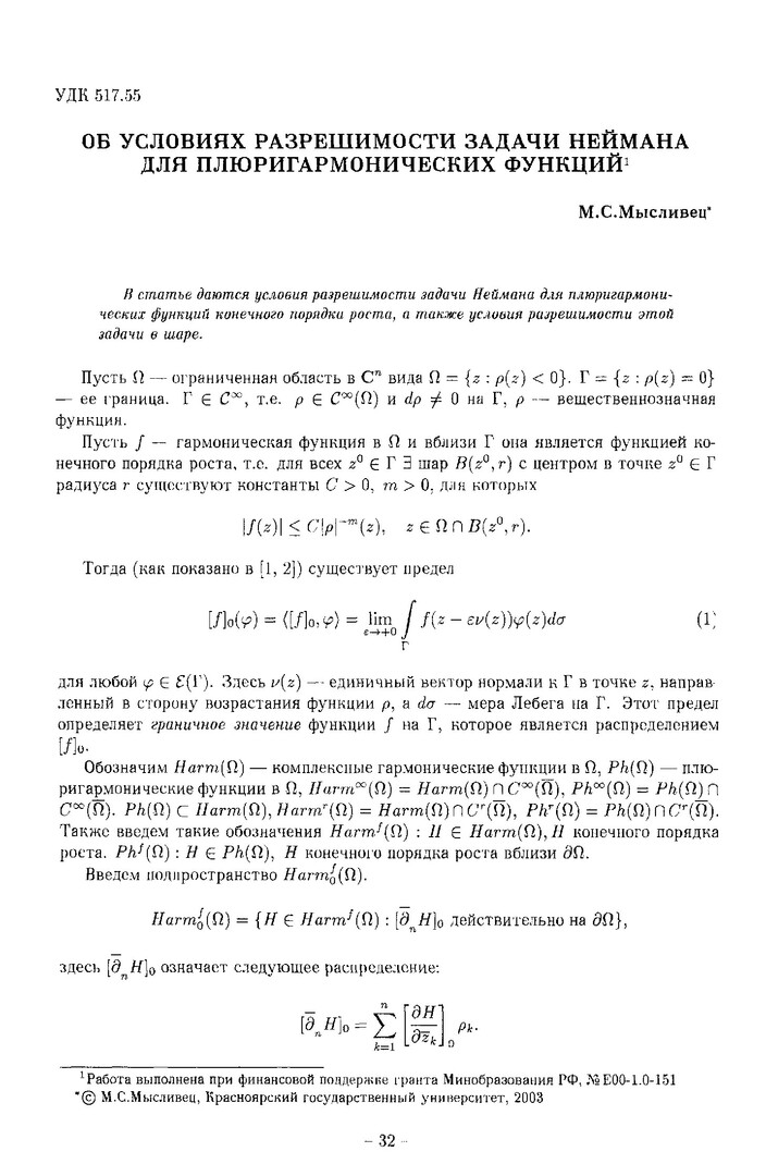 Библиографическое описание:Мысливец, Максим Сергеевич. Об условиях разрешимости задачи Неймана для плюригармонических функций / М. С. Мысливец. - Текст : непосредственный // Вестник Красноярского государственного университета. - 2003. - Физико-математические науки, № 1. - С. 32-34. - Библиогр. в конце ст.