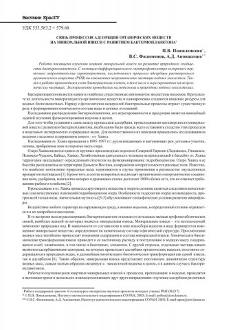 Библиографическое описание:Пожиленкова, П. В. Связь процессов адсорбции органических веществ на минеральной взвеси с развитием бактериопланктона / П. В. Пожиленкова, В. С. Филимонов, А. Д. Апонасенко. - Текст : непосредственный // Вестник Красноярского государственного университета. - 2003. - Физико-математические науки, № 3. - С. 102-107. - Библиогр. в конце ст.
