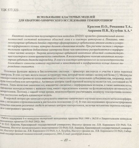 Библиографическое описание:Использование кластерных моделей для квантово-химического исследования гемопротеинов / П. О. Краснов, Т. А. Романова, П. В. Аврамов, А. А. Кузубов. - Текст : непосредственный // Вестник Красноярского государственного университета. - 2003. - Физико-математические науки, № 3. - С. 49-54. - Библиогр. в конце ст.