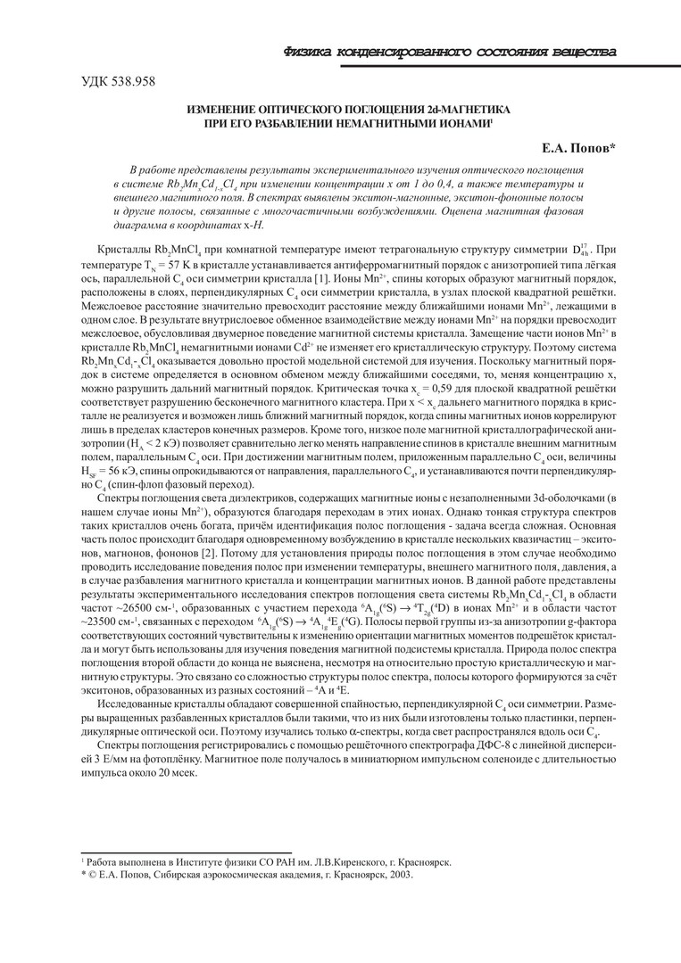 Библиографическое описание:Попов, Е. А. Изменение оптического поглощения 2d-магнетика при его разбавлении немагнитными ионами / Е. А. Попов. - Текст : непосредственный // Вестник Красноярского государственного университета. - 2003. - Физико-математические науки, № 3. - С. 75-79. - Библиогр. в конце ст.