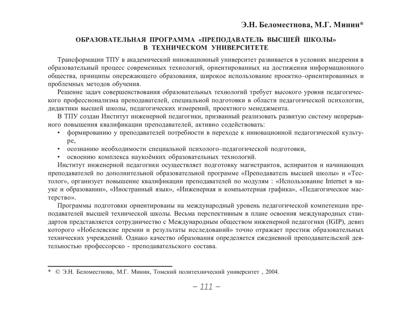 Библиографическое описание:Беломестнова, Э. Н. Образовательная программа "Преподаватель высшей школы" в техническом университете / Э. Н. Беломестнова, М. Г. Минин. - Текст : непосредственный // Вестник Красноярского государственного университета. - 2004. - Гуманитарные науки, № 4. - С. 111-112.