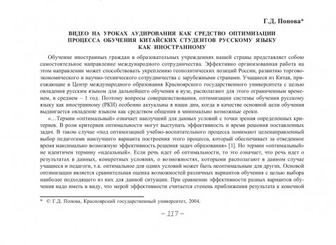 Библиографическое описание:Попова, Галина Дмитриевна. Видео на уроках аудирования как средство оптимизации процесса обучения китайских студентов русскому языку как иностранному / Г. Д. Попова. - Текст : непосредственный // Вестник Красноярского государственного университета. - 2004. - Гуманитарные науки, № 4. - С. 117-123. - Библиогр. в конце ст.