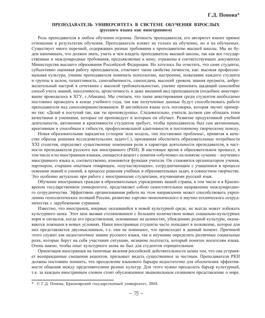 Библиографическое описание:Попова, Галина Дмитриевна. Преподаватель университета в системе обучения взрослых (русского языка как иностранного) / Г. Д. Попова. - Текст : непосредственный // Вестник Красноярского государственного университета. - 2004. - Гуманитарные науки, № 4. - С. 75-76. - Библиогр. в конце ст.