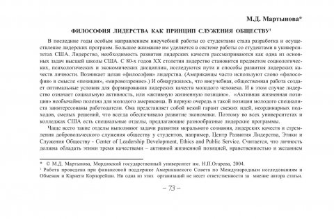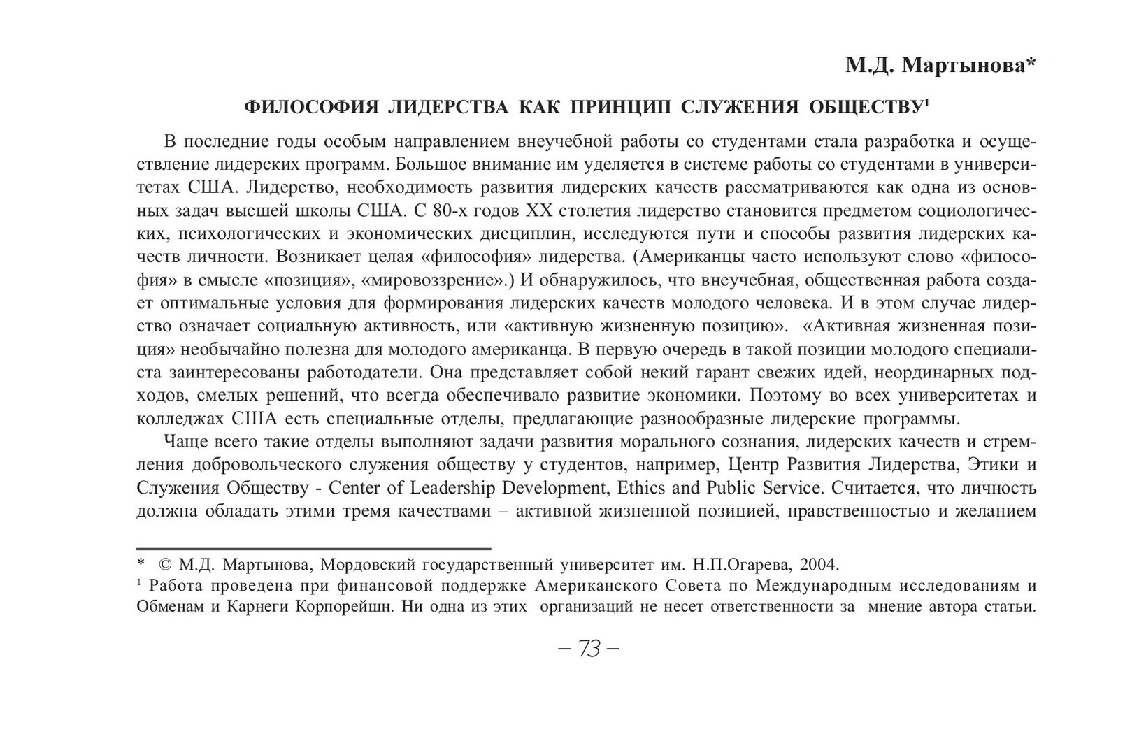 Мартынова, М. Д. Философия лидерства как принцип служения обществу / М. Д. Мартынова. - Текст : непосредственный // Вестник Красноярского государственного университета. - 2004. - Гуманитарные науки, № 4. - С. 73-75.