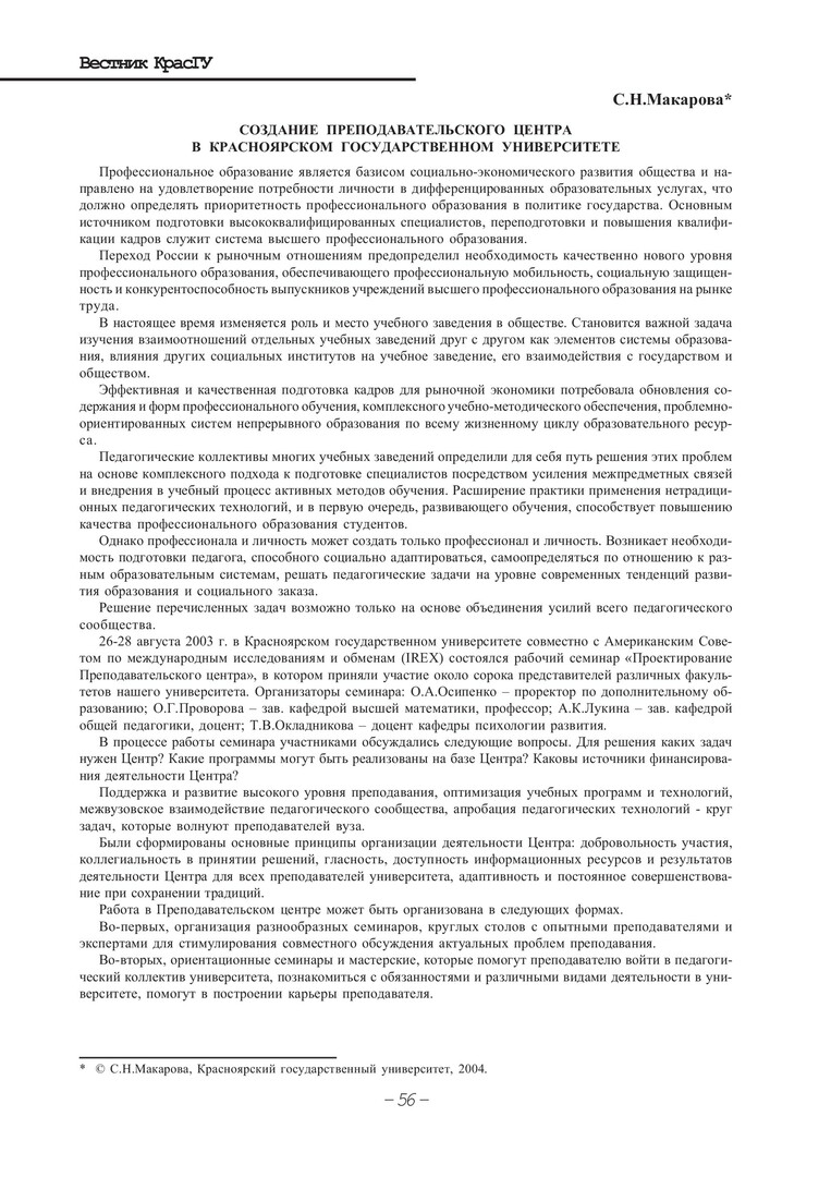 Библиографическое описание:Макарова, Светлана Николаевна. Создание Преподавательского центра в Красноярском государственном университете / С. Н. Макарова. - Текст : непосредственный // Вестник Красноярского государственного университета. - 2004. - Гуманитарные науки, № 4. - С. 56-57.