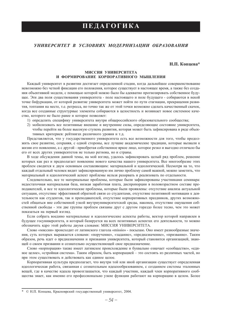 Библиографическое описание:Копцева, Наталья Петровна. Миссия университета и формирование корпоративного мышления / Н. П. Копцева. - Текст : непосредственный // Вестник Красноярского государственного университета. - 2004. - Гуманитарные науки, № 4. - С. 54-55.