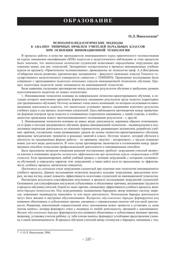 Библиографическое описание:Никольская, О. Л. Психолого-педагогические подходы к анализу типичных проблем учителей начальных классов при освоении инновационной технологии / О. Л. Никольская. - Текст : непосредственный // Вестник Красноярского государственного университета. - 2004. - Гуманитарные науки, № 6. - С. 180-182. - Библиогр. в конце ст.