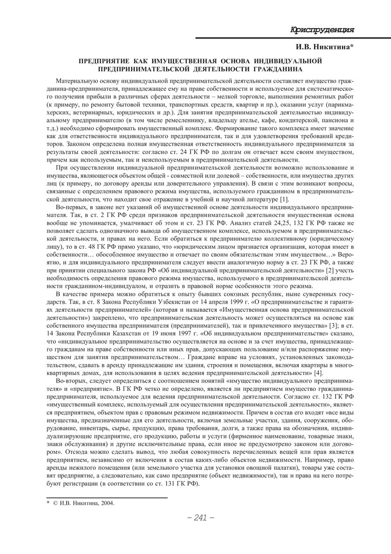 Библиографическое описание:Никитина, Ирина Вениаминовна. Предприятие как имущественная основа индивидуальной предпринимательской деятельности гражданина / И. В. Никитина. - Текст : непосредственный // Вестник Красноярского государственного университета. - 2004. - Гуманитарные науки, № 6. - С. 241-245. - Библиогр. в конце ст.