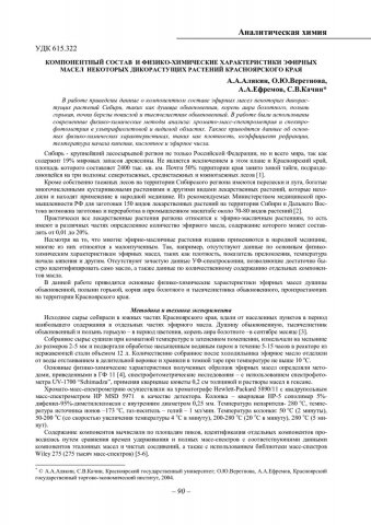 Библиографическое описание:Компонентный состав и физико-химические характеристики эфирных масел некоторых дикорастущих растений Красноярского края / А. А. Алякин, О. Ю. Веретнова, А. А. Ефремов, С. В. Качин. - Текст : непосредственный // Вестник Красноярского государственного университета. - 2004. - Естественные науки, № 2. - С. 90-95. - Библиогр. в конце ст.