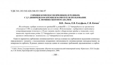 Библиографическое описание:Лосев, Владимир Николаевич. Сорбция комплексов иридия(III) и родия(III) с 2,2'-дипиридилом кремнеземами и ее использование в люминесцентном анализе / В. Н. Лосев, Е. В. Елсуфьев, С. В. Качин. - Текст : непосредственный // Вестник Красноярского государственного университета. - 2004. - Естественные науки, № 2. - С. 100-104. - Библиогр. в конце ст.