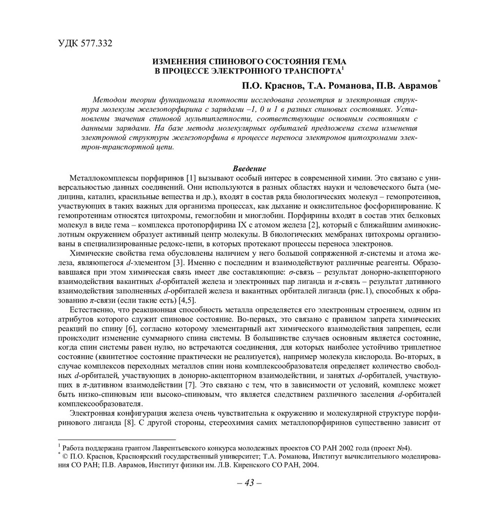 Библиографическое описание:Краснов, Павел Олегович. Изменение спинового состояния гема в процессе электронного транспорта / П. О. Краснов, Т. А. Романова, П. В. Аврамов. - Текст : непосредственный // Вестник Красноярского государственного университета. - 2004. - Естественные науки, № 2. - С. 43-48. - Библиогр. в конце ст.
