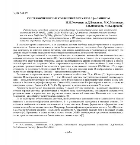 Библиографическое описание:Синтез комплексных соединений металлов с β-аланином / Н. Н. Головнев, А. Д. Васильев, М. С. Молокеев [и др.]. - Текст : непосредственный // Вестник Красноярского государственного университета. - 2004. - Естественные науки, № 2. - С. 14-20. - Библиогр. в конце ст.