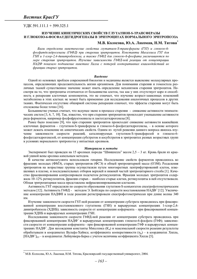 Библиографическое описание:Колосова, М. В. Изучение кинетических свойств глутатион-S-трансферазы и глюкозо-6-фосфатдегидрогеназы в эритроцитах нормального эритропоэза / М. В. Колосова, Ю. А. Лакомая, Н. М. Титова. - Текст : непосредственный // Вестник Красноярского государственного университета. - 2004. - Естественные науки, № 7. - С. 163-166. - Библиогр. в конце ст.
