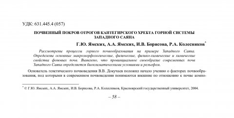 Библиографическое описание:Почвенный покров отрогов Кантегирского хребта горной системы Западного Саяна / Г. Ю. Ямских, А. А. Ямских, И. В. Борисова, Р. А. Колесников. - Текст : непосредственный // Вестник Красноярского государственного университета. - 2004. - Естественные науки, № 7. - С. 58-66. - Библиогр. в конце ст.