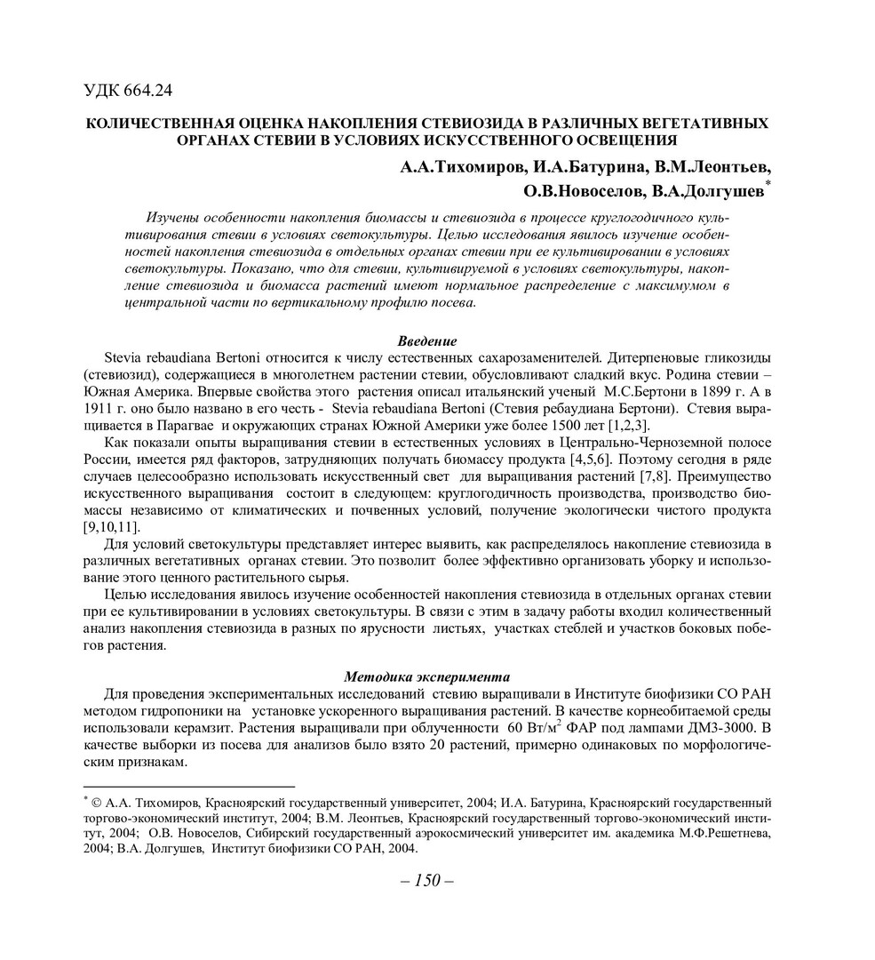 Библиографическое описание:Количественная оценка накопления стевиозида в различных вегетативных органах стевии в условиях искусственного освещения / А. А. Тихомиров, И. А. Батурина, В. М. Леонтьев [и др.]. - Текст : непосредственный // Вестник Красноярского государственного университета. - 2004. - Естественные науки, № 7. - С. 150-156. - Библиогр. в конце ст.