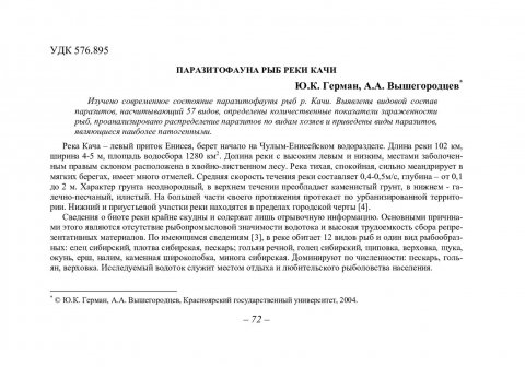 Библиографическое описание:Герман, Ю. К. Паразитофауна рыб реки Качи / Ю. К. Герман, А. А. Вышегородцев. - Текст : непосредственный // Вестник Красноярского государственного университета. - 2004. - Естественные науки, № 7. - С. 72-77. - Библиогр. в конце ст.