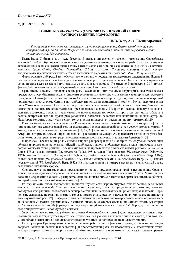 Библиографическое описание:Зуев, Иван Владимирович. Гольяны рода Phoxinus (Cyprinidae) Восточной Сибири: распространение, морфология / И. В. Зуев, А. А. Вышегородцев. - Текст : непосредственный // Вестник Красноярского государственного университета. - 2004. - Естественные науки, № 7. - С. 82-88. - Библиогр. в конце ст.