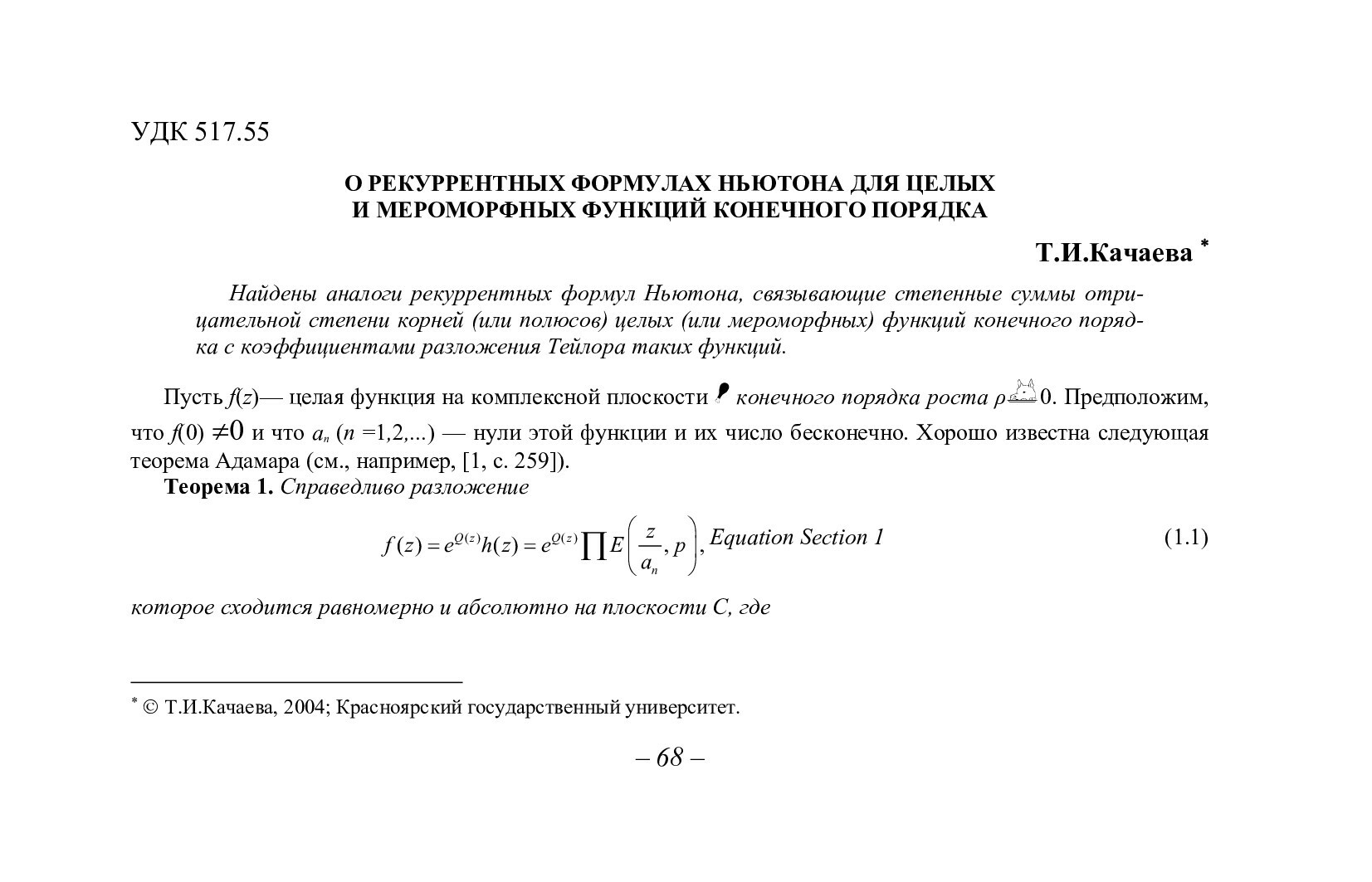 Библиографическое описание:Качаева, Татьяна Ивановна. О рекуррентных формулах Ньютона для целых и мероморфных функций конечного порядка / Т. И. Качаева. - Текст : непосредственный // Вестник Красноярского государственного университета. - 2004. - Физико-математические науки, № 3. - С. 68-72. - Библиогр. в конце ст.
