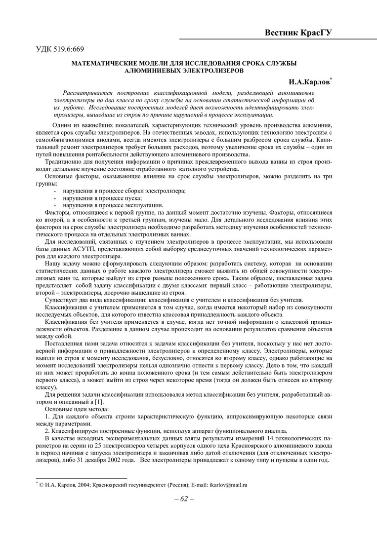 Библиографическое описание:Карлов, Иван Александрович. Математические модели для исследования срока службы алюминиевых электролизеров / И. А. Карлов. - Текст : непосредственный // Вестник Красноярского государственного университета. - 2004. - Физико-математические науки, № 3. - С. 62-68. - Библиогр. в конце ст.