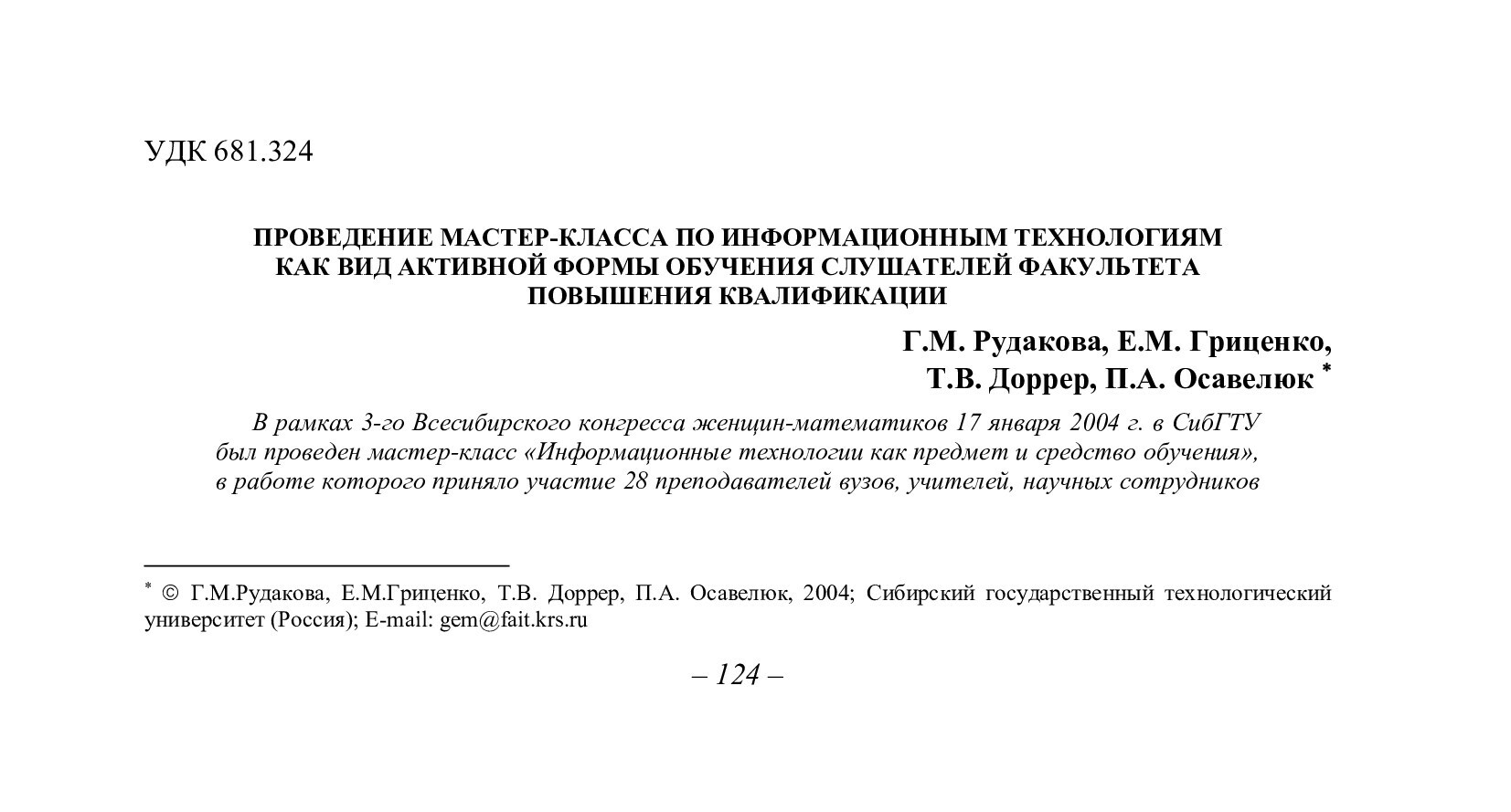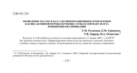 Библиографическое описание:Проведение мастер-класса по информационным технологиям как вид активной формы обучения слушателей факультета повышения квалификации / Г. М. Рудакова, Е. М. Гриценко, Т. В. Доррер, П. А. Осавелюк. - Текст : непосредственный // Вестник Красноярского государственного университета. - 2004. - Физико-математические науки, № 3. - С. 125-133. - Библиогр. в конце ст.