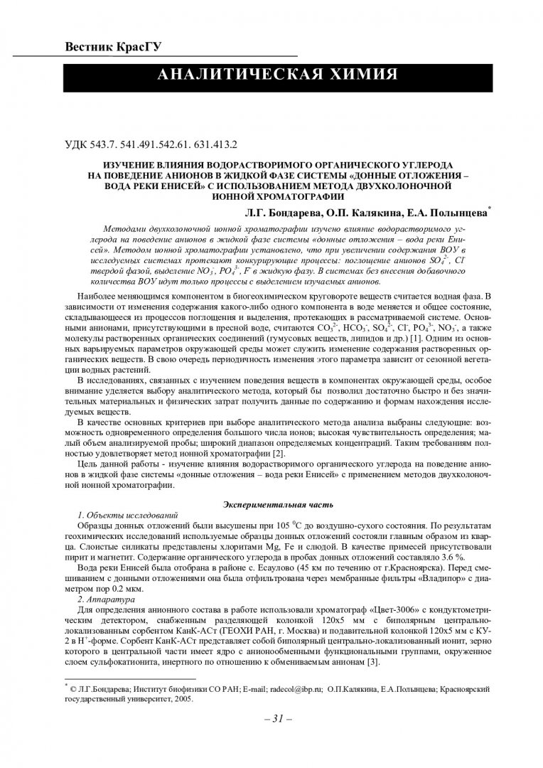Изучение влияния водорастворимого органического углерода на поведение анионов в жидкой фазе системы "донные отложения - вода реки Енисей" с использованием метода двухколоночной ионной хроматографии