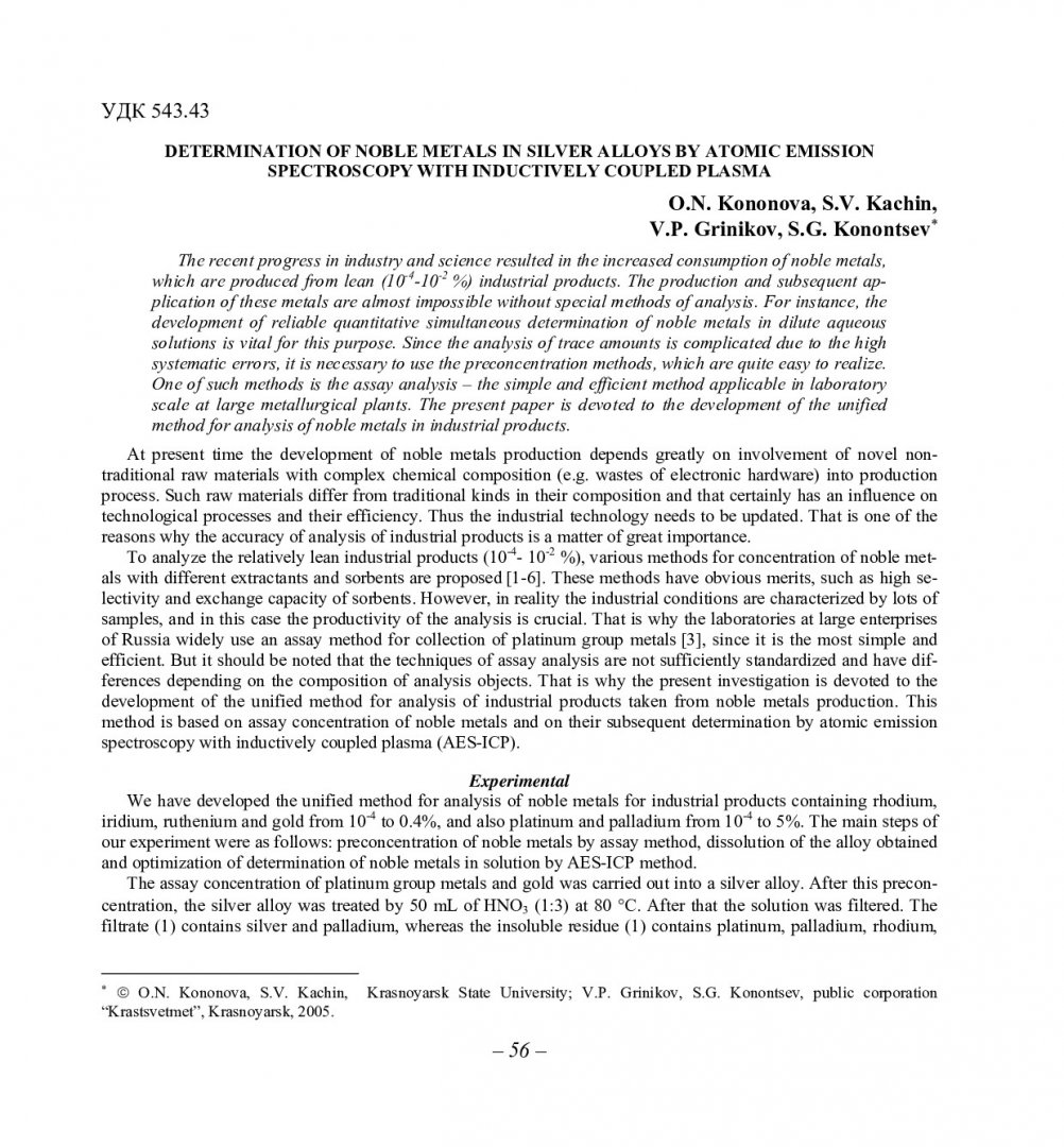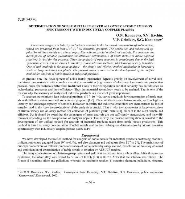 Библиографическое описание:Determination of Noble Metals in Silver Alloys by Atomic Emission Spectroscopy with Inductively Coupled Plasma / O. N. Kononova, S. V. Kachin, V. P. Grinikov, S. G. Konontsev. - Текст : непосредственный // Вестник Красноярского государственного университета. - 2005. - Естественные науки, № 2. - С. 56-61. - Библиогр. в конце ст.